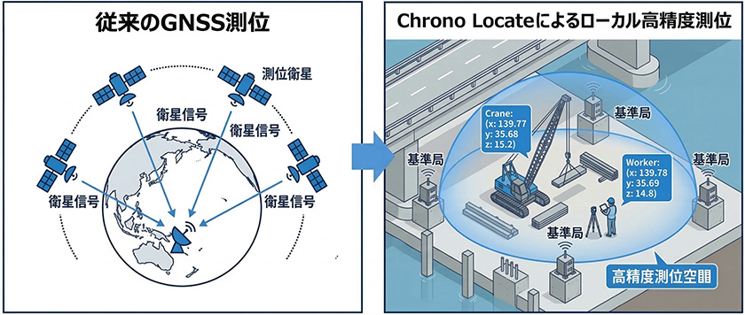 衛星測位が届かない環境でも位置を高精度に把握する次世代測位技術「Chrono Locate™」の建設現場実証を実施。屋内・地下など非GNSS環境での高精度測位により施工の高度化と生産性向上を実現。