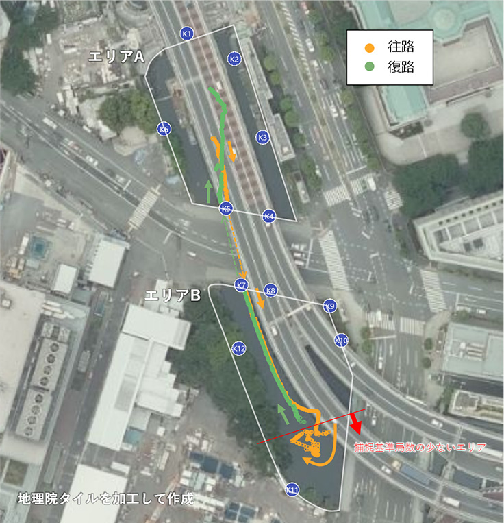 首都高速道路高架橋下の施工エリアに基地局を12カ所設置し、日本橋川を行き来する通船(移動局)の追尾試験を実施しました。
