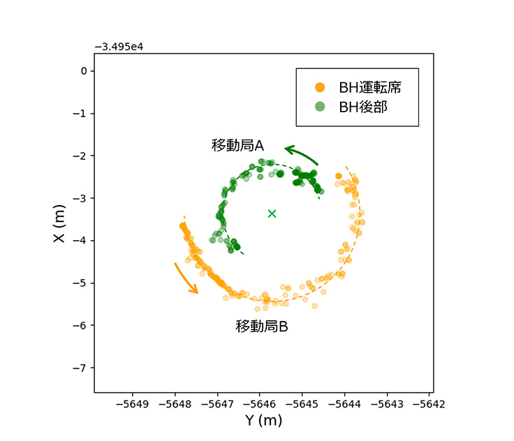 ② バックホウ前後に取り付けた2つの移動局により、ブーム旋回を連続的に安定して追尾できることを確認しました。将来的には、浚渫位置の正確な把握に応用できることを確認しました。