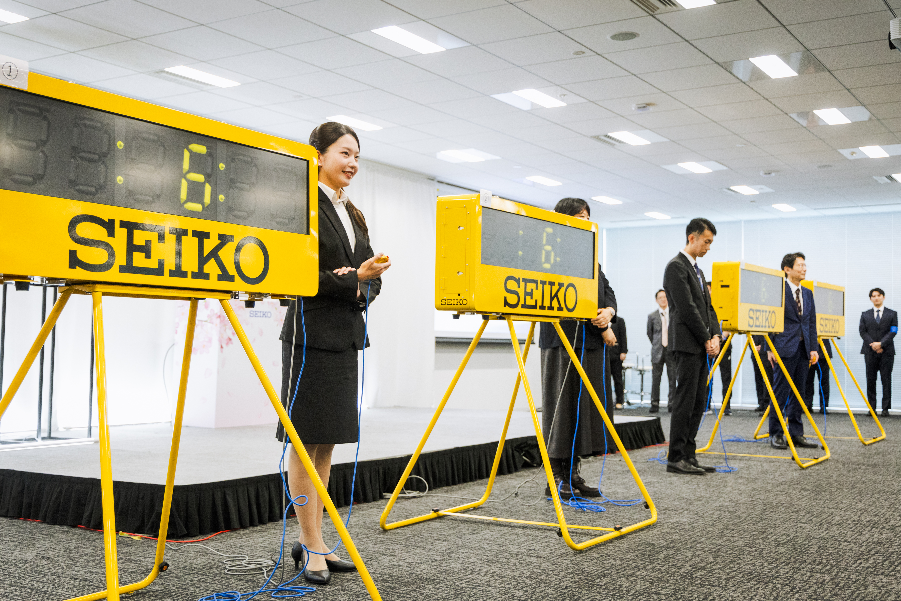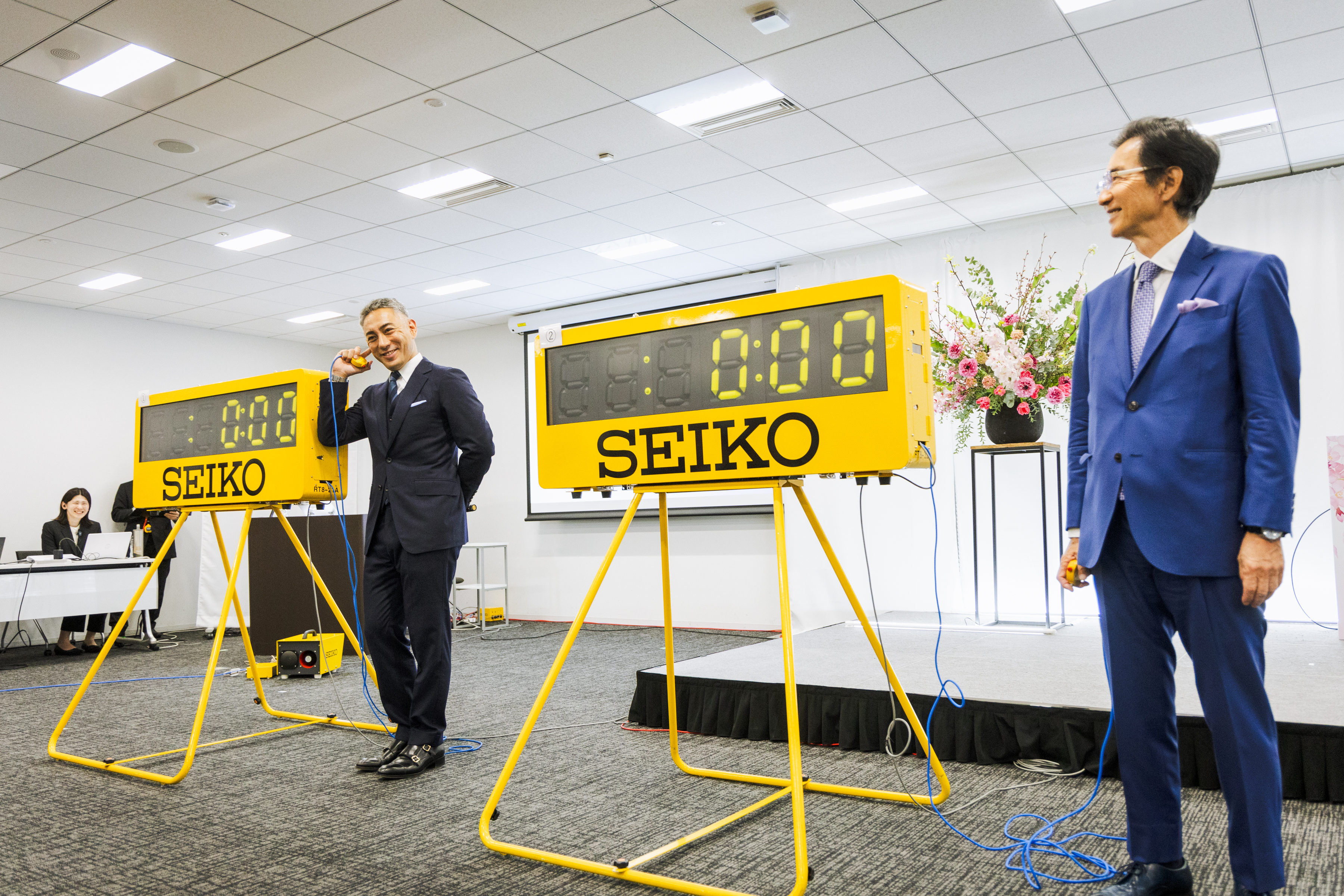 - 新入社員と役員対抗で、セイコータイマーを使用して山縣選手が持つ陸上男子100m日本記録でタイマーストップを目指すレクリエーションゲーム